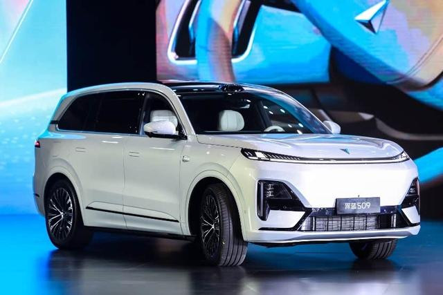 深蓝S09此前已经正式发布,这款车会在上海车展开启预售,预计售价35万。深蓝S09的外形非常的大气,封闭式前脸搭配一体式星环大灯,很有标志性。车身饱满立体,采用多辐式铝合金轮毂造型,彰显豪华车的风范。尾部造型非常简洁,贯穿式尾灯很有巧思,科技感出众。深蓝S09的长宽高尺寸为5205/1996/1800mm,轴距3105mm,在同级车中还是有一定优势,采用2+2+2的6座布局。